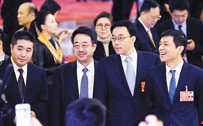 3月15日上午,蘇權科(前排左二)在人民大會堂委員通道答記者問。