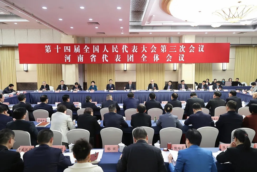 3月5日下午,十四屆全國(guó)人大三次會(huì)議河南代表團(tuán)舉行全體會(huì)議,審議政府工作報(bào)告。中共中央政治局委員、國(guó)務(wù)院副總理劉國(guó)中,最高人民法院院長(zhǎng)張軍參加審議并發(fā)言。省委書記、省人大常委會(huì)主任、河南代表團(tuán)團(tuán)長(zhǎng)劉寧主持會(huì)議并發(fā)言,省長(zhǎng)、河南代表團(tuán)副團(tuán)長(zhǎng)王凱參加審議并發(fā)言。十四屆全國(guó)人大憲法和法律委員會(huì)主任委員信春鷹、十四屆全國(guó)人大農(nóng)業(yè)與農(nóng)村委員會(huì)副主任委員李紀(jì)恒參加審議。農(nóng)業(yè)農(nóng)村部部長(zhǎng)韓俊到團(tuán)聽取審議意見。
