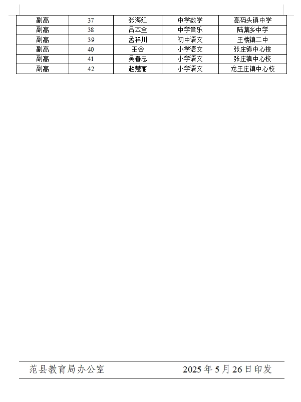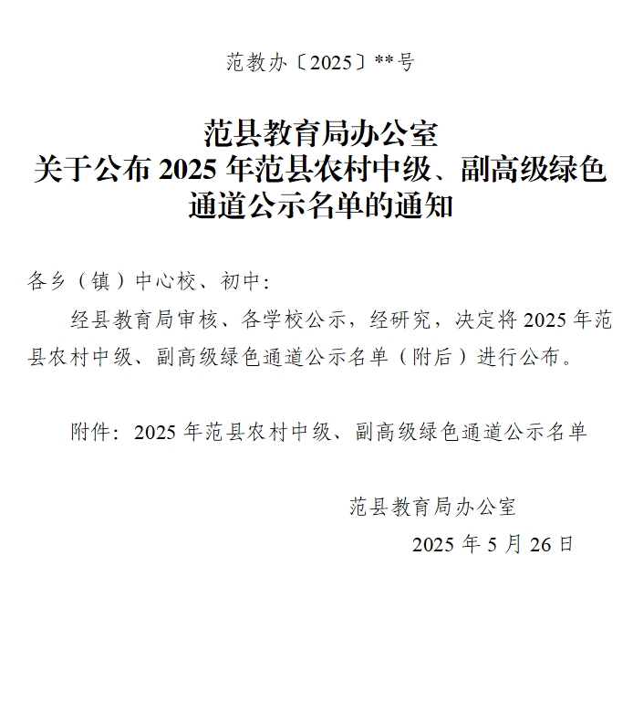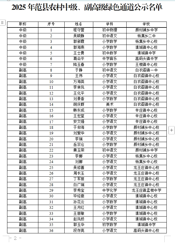 范縣教育局辦公室關(guān)于公布2025年范縣農(nóng)村中級(jí) 副高級(jí)綠色通道公示名單的通知